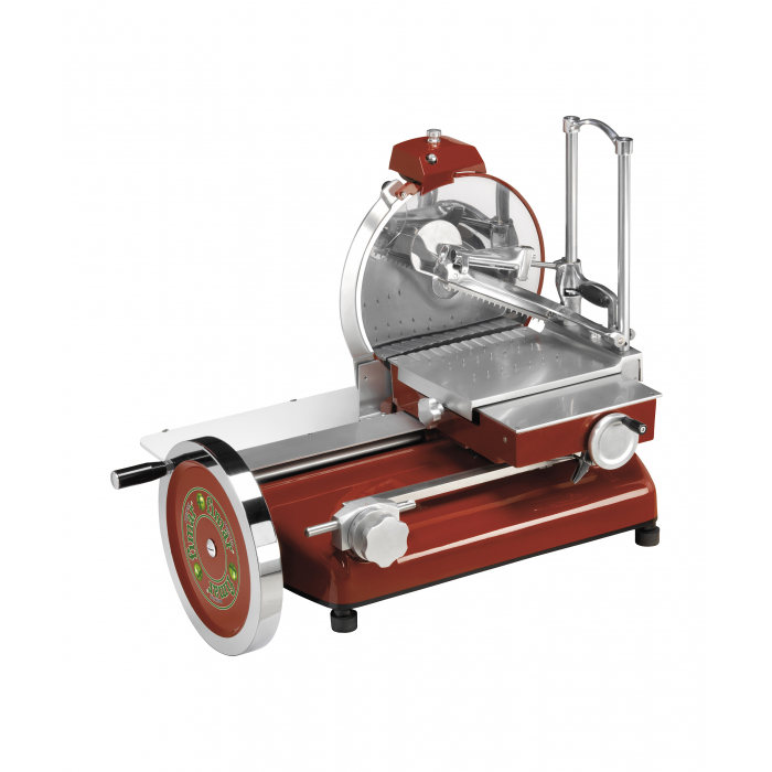 Hånddrevet maskin for skjæring av pålegg. Rød- eller svartmalt overflate. Bladbeskyttelse fast ring. Justering av skjæretykkelse og automatisk fremføring av mater. Skjæretykkelse fra 0 til 25 mm. Tilbehør: Støpejernsfot, malt i rødt eller svart.